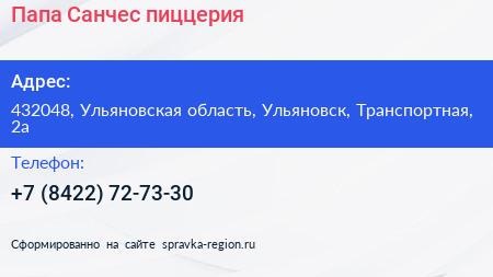 Папа Санчес, пиццерия по адресу 432048, Ульяновская область, Ульяновск, Транспортная, 2а в дальнейшем Организация, размещена в следующих категориях: