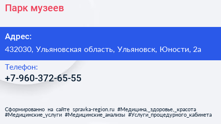 Парк музеев по адресу 432030, Ульяновская область, Ульяновск, Юности, 2а в дальнейшем Организация, размещена в следующих категориях: