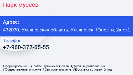 Парк музеев по адресу 432030, Ульяновская область, Ульяновск, Юности, 2а ст1 в дальнейшем Организация, размещена в следующих категориях: