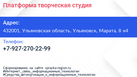 Платформа, творческая студия по адресу 432001, Ульяновская область, Ульяновск, Марата, 8 к4 в дальнейшем Организация, размещена в следующих категориях: