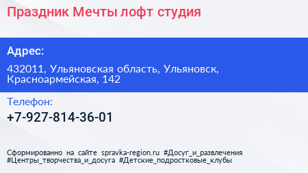 Праздник Мечты, лофт студия по адресу 432011, Ульяновская область, Ульяновск, Красноармейская, 142 в дальнейшем Организация, размещена в следующих категориях: