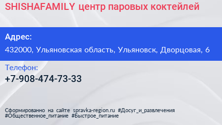SHISHAFAMILY, центр паровых коктейлей по адресу 432000, Ульяновская область, Ульяновск, Дворцовая, 6 в дальнейшем Организация, размещена в следующих категориях: