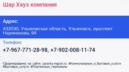 Шар Хауз, компания по адресу 432030, Ульяновская область, Ульяновск, проспект Нариманова, 84 в дальнейшем Организация, размещена в следующих категориях: