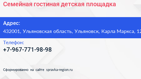 Семейная гостиная, детская площадка по адресу 432001, Ульяновская область, Ульяновск, Карла Маркса, 12 в дальнейшем Организация, размещена в следующих категориях: