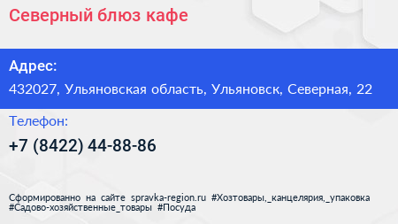 Северный блюз, кафе по адресу 432027, Ульяновская область, Ульяновск, Северная, 22 в дальнейшем Организация, размещена в следующих категориях:
