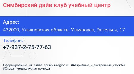 Симбирский дайв-клуб, учебный центр по адресу 432000, Ульяновская область, Ульяновск, Энгельса, 17 в дальнейшем Организация, размещена в следующих категориях: