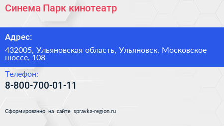 Синема Парк, кинотеатр по адресу 432005, Ульяновская область, Ульяновск, Московское шоссе, 108 в дальнейшем Организация, размещена в следующих категориях: