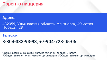 Соренто, пиццерия по адресу 432059, Ульяновская область, Ульяновск, 40 летия Победы, 29 в дальнейшем Организация, размещена в следующих категориях: