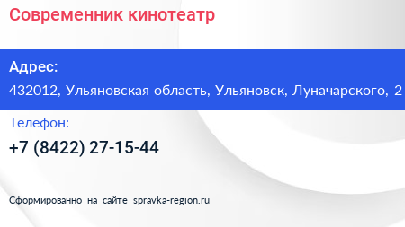 Современник, кинотеатр по адресу 432012, Ульяновская область, Ульяновск, Луначарского, 2 в дальнейшем Организация, размещена в следующих категориях:
