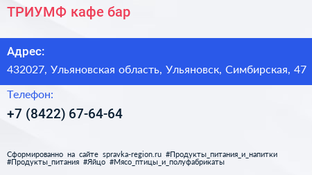 ТРИУМФ, кафе-бар по адресу 432027, Ульяновская область, Ульяновск, Симбирская, 47 в дальнейшем Организация, размещена в следующих категориях: