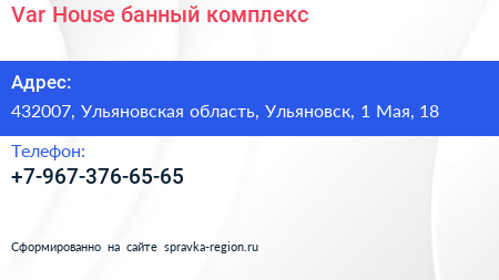Var House, банный комплекс по адресу 432007, Ульяновская область, Ульяновск, 1 Мая, 18 в дальнейшем Организация, размещена в следующих категориях: