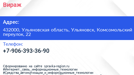 Вираж по адресу 432000, Ульяновская область, Ульяновск, Комсомольский переулок, 22 в дальнейшем Организация, размещена в следующих категориях: