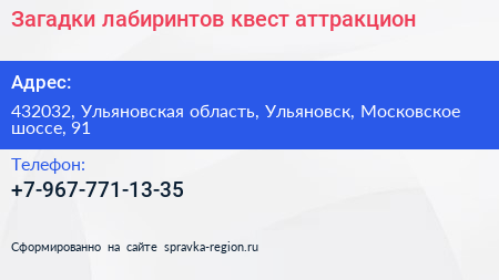 Загадки лабиринтов, квест-аттракцион по адресу 432032, Ульяновская область, Ульяновск, Московское шоссе, 91 в дальнейшем Организация, размещена в следующих категориях: