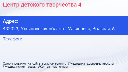 Центр детского творчества №4 по адресу 432023, Ульяновская область, Ульяновск, Вольная, 6 в дальнейшем Организация, размещена в следующих категориях: