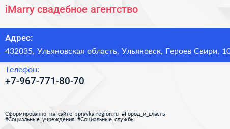 iMarry, свадебное агентство по адресу 432035, Ульяновская область, Ульяновск, Героев Свири, 10 в дальнейшем Организация, размещена в следующих категориях: