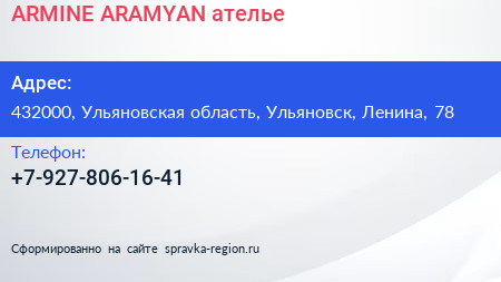 ARMINE ARAMYAN, ателье по адресу 432000, Ульяновская область, Ульяновск, Ленина, 78 в дальнейшем Организация, размещена в следующих категориях: