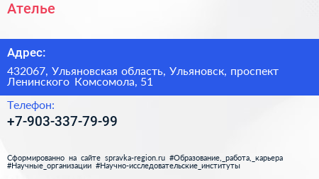 Ателье по адресу 432067, Ульяновская область, Ульяновск, проспект Ленинского Комсомола, 51 в дальнейшем Организация, размещена в следующих категориях: