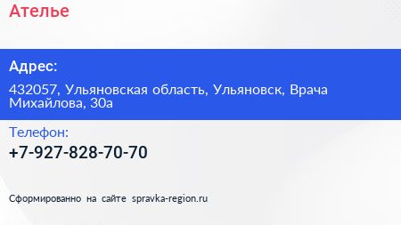 Ателье по адресу 432057, Ульяновская область, Ульяновск, Врача Михайлова, 30а в дальнейшем Организация, размещена в следующих категориях: