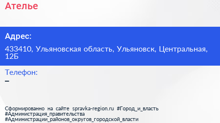 Ателье по адресу 433410, Ульяновская область, Ульяновск, Центральная, 12Б в дальнейшем Организация, размещена в следующих категориях: