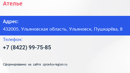 Ателье по адресу 432005, Ульяновская область, Ульяновск, Пушкарёва, 8 в дальнейшем Организация, размещена в следующих категориях: