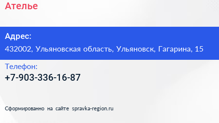 Ателье по адресу 432002, Ульяновская область, Ульяновск, Гагарина, 15 в дальнейшем Организация, размещена в следующих категориях: