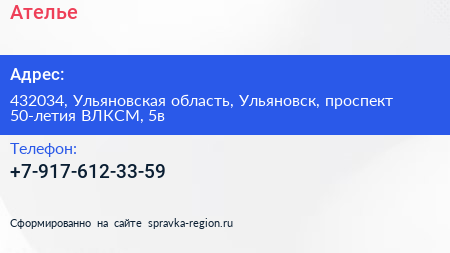 Ателье по адресу 432034, Ульяновская область, Ульяновск, проспект 50-летия ВЛКСМ, 5в в дальнейшем Организация, размещена в следующих категориях: