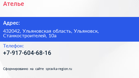 Ателье по адресу 432042, Ульяновская область, Ульяновск, Станкостроителей, 10а в дальнейшем Организация, размещена в следующих категориях: