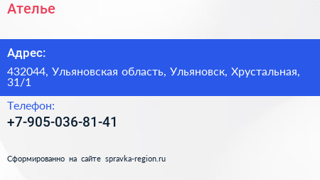 Ателье по адресу 432044, Ульяновская область, Ульяновск, Хрустальная, 31/1 в дальнейшем Организация, размещена в следующих категориях: