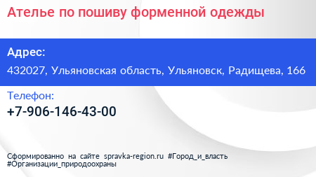 Ателье по пошиву форменной одежды по адресу 432027, Ульяновская область, Ульяновск, Радищева, 166 в дальнейшем Организация, размещена в следующих категориях: