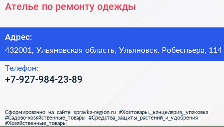 Ателье по ремонту одежды по адресу 432001, Ульяновская область, Ульяновск, Робеспьера, 114 в дальнейшем Организация, размещена в следующих категориях: