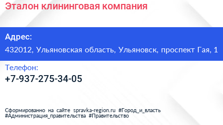 Эталон, клининговая компания по адресу 432012, Ульяновская область, Ульяновск, проспект Гая, 1 в дальнейшем Организация, размещена в следующих категориях: