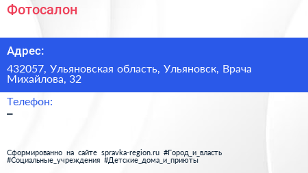 Фотосалон по адресу 432057, Ульяновская область, Ульяновск, Врача Михайлова, 32 в дальнейшем Организация, размещена в следующих категориях: