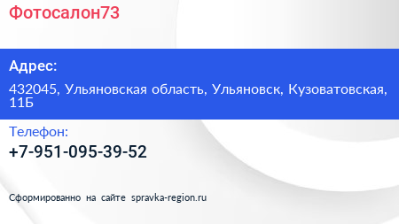 Фотосалон73 по адресу 432045, Ульяновская область, Ульяновск, Кузоватовская, 11Б в дальнейшем Организация, размещена в следующих категориях: