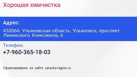 Хорошая, химчистка по адресу 432064, Ульяновская область, Ульяновск, проспект Ленинского Комсомола, 6 в дальнейшем Организация, размещена в следующих категориях: