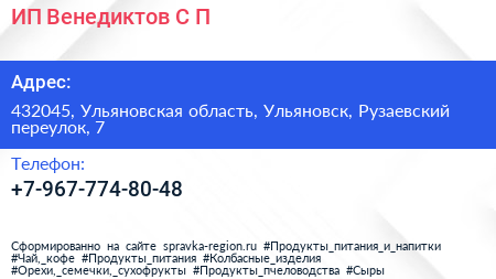 ИП Венедиктов С.П. по адресу 432045, Ульяновская область, Ульяновск, Рузаевский переулок, 7 в дальнейшем Организация, размещена в следующих категориях: