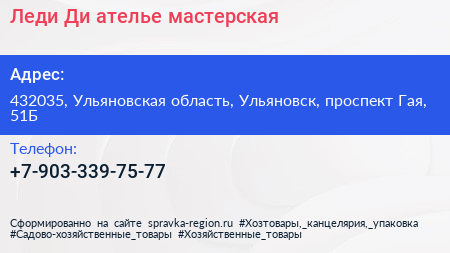 Леди Ди, ателье-мастерская по адресу 432035, Ульяновская область, Ульяновск, проспект Гая, 51Б в дальнейшем Организация, размещена в следующих категориях: