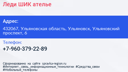 Леди ШИК, ателье по адресу 432067, Ульяновская область, Ульяновск, Ульяновский проспект, 6 в дальнейшем Организация, размещена в следующих категориях: