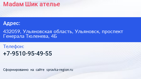 Маdам Шик, ателье по адресу 432059, Ульяновская область, Ульяновск, проспект Генерала Тюленева, 4Б в дальнейшем Организация, размещена в следующих категориях: