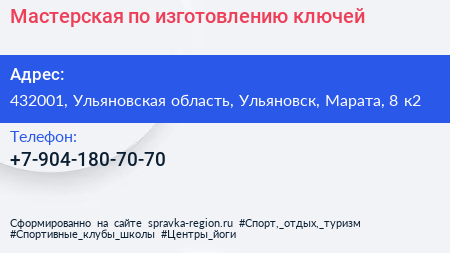 Мастерская по изготовлению ключей по адресу 432001, Ульяновская область, Ульяновск, Марата, 8 к2 в дальнейшем Организация, размещена в следующих категориях: