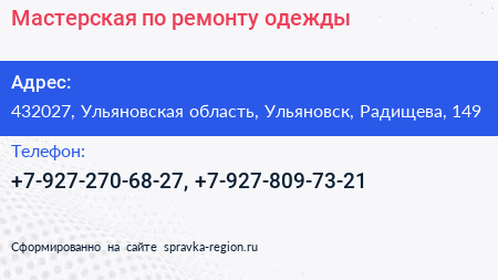 Мастерская по ремонту одежды по адресу 432027, Ульяновская область, Ульяновск, Радищева, 149 в дальнейшем Организация, размещена в следующих категориях: