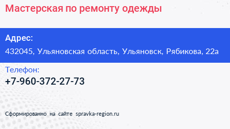Мастерская по ремонту одежды по адресу 432045, Ульяновская область, Ульяновск, Рябикова, 22а в дальнейшем Организация, размещена в следующих категориях:
