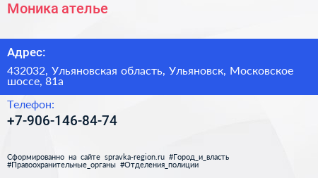 Моника, ателье по адресу 432032, Ульяновская область, Ульяновск, Московское шоссе, 81а в дальнейшем Организация, размещена в следующих категориях: