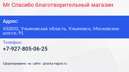 Mr.Спасибо, благотворительный магазин по адресу 432032, Ульяновская область, Ульяновск, Московское шоссе, 91 в дальнейшем Организация, размещена в следующих категориях: