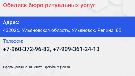 Обелиск, бюро ритуальных услуг по адресу 432026, Ульяновская область, Ульяновск, Репина, 8Б в дальнейшем Организация, размещена в следующих категориях: