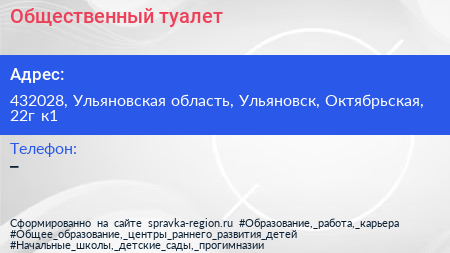 Общественный туалет по адресу 432028, Ульяновская область, Ульяновск, Октябрьская, 22г к1 в дальнейшем Организация, размещена в следующих категориях: