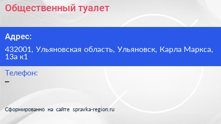 Общественный туалет по адресу 432001, Ульяновская область, Ульяновск, Карла Маркса, 13а к1 в дальнейшем Организация, размещена в следующих категориях: