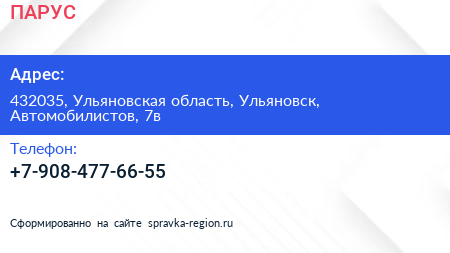 ПАРУС по адресу 432035, Ульяновская область, Ульяновск, Автомобилистов, 7в в дальнейшем Организация, размещена в следующих категориях: