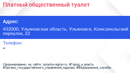 Платный общественный туалет по адресу 432000, Ульяновская область, Ульяновск, Комсомольский переулок, 22 в дальнейшем Организация, размещена в следующих категориях: