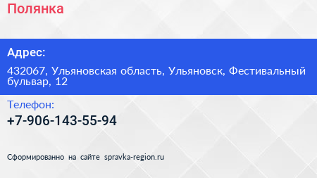 Полянка по адресу 432067, Ульяновская область, Ульяновск, Фестивальный бульвар, 12 в дальнейшем Организация, размещена в следующих категориях: