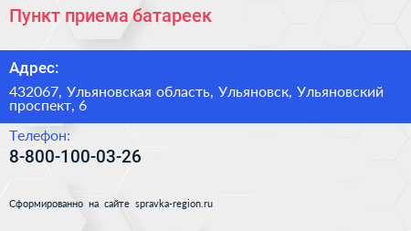 Пункт приема батареек по адресу 432067, Ульяновская область, Ульяновск, Ульяновский проспект, 6 в дальнейшем Организация, размещена в следующих категориях: